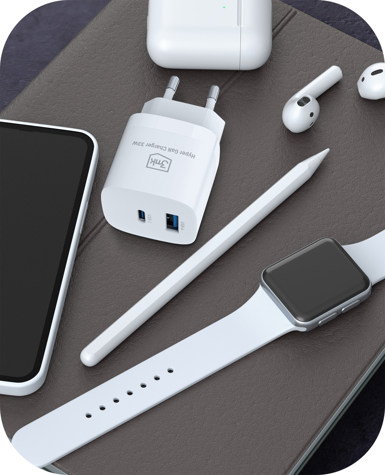 Projektując Hyper GaN Charger 33W postawiliśmy na nowoczesny design i kompaktowy rozmiar. Ładowarka jest elegancka i bez problemu zmieści się do kieszeni, torebki lub nerki. Dlatego teraz ładowarkę możesz mieć zawsze przy sobie, aby naładować telefon, tablet i laptop, gdy tego potrzebujesz. Poręczna i mocna – taka właśnie jest Hyper GaN Charger 33W!